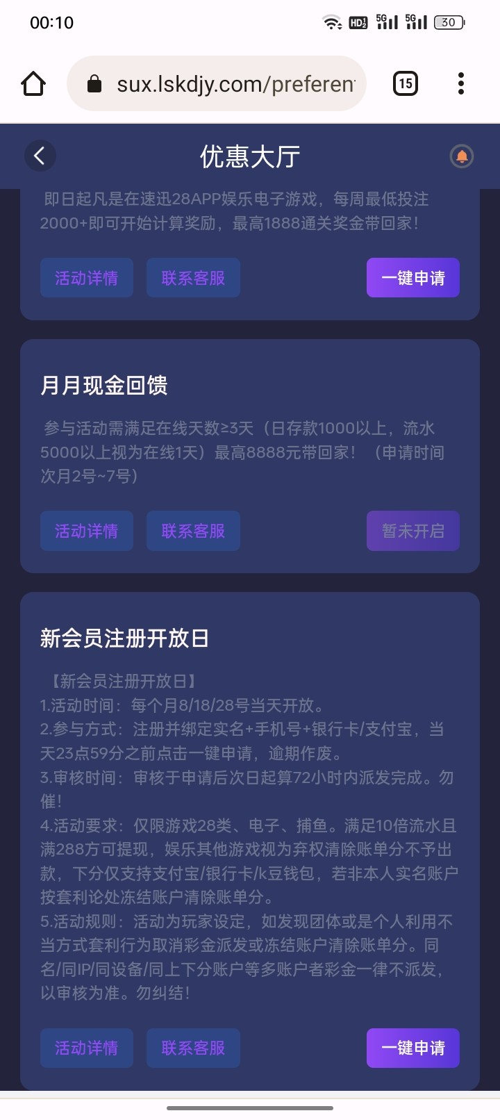 每月8~18号~28号。注册的新用户即可申请,绑定基本信息,在优惠中心一键申请,申请会比较久这个,比如8号申请的。9号才开始审核,统一发放的